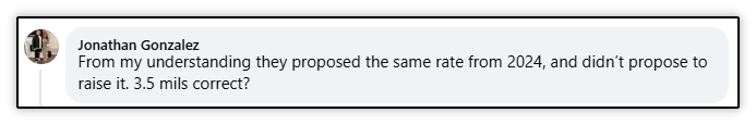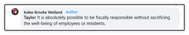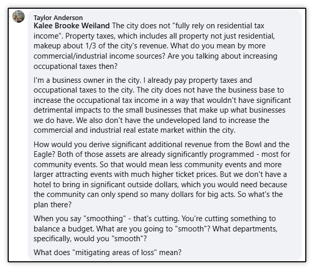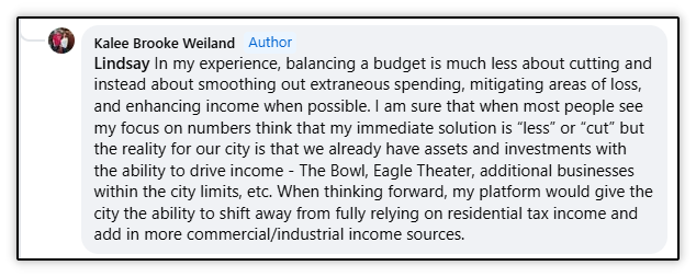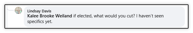 This follows a pattern by this candidate. Below is an interaction with her where she was not able to provide clear answers to very straightforward questions about her policy position on the budget. This occurred on a local Facebook group on a thread she started regarding the city’s millage rate hearing.