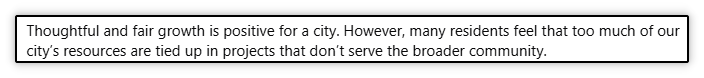 Next, she says that “too much of our city’s resources are tied up in projects that don’t serve the broader community”. Again, no specifics - no projects named, no description of resources, no examples of projects that she would support that would “serve the broader community”.