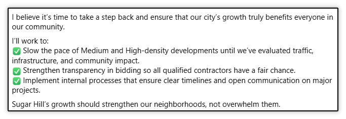 I’m not sure what “fair growth” means - it’s not defined. What is “fair growth”? The city, as previously documented, is growing slower than ever. The city’s comprehensive plan, Envision100, which is the community developed plan for the city’s growth, is the guiding document. The two city councilmembers who have endorsed this candidate voted against the community developed comprehensive plan.