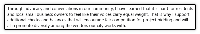 Where has there not been “fair competition for project bidding” and what “additional checks and balances” is she proposing? What does “promote diversity among the vendors our city works with” mean?