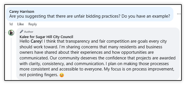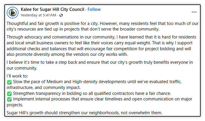 This individual who is running for the current post I serve the citizens of Sugar Hill from posted this on her Facebook campaign page yesterday.