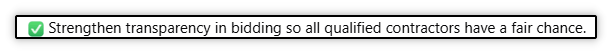 Checkmark 2: This no subtly implies that qualified contractors have NOT had a “fair chance”. That is completely false. All qualified bidders have the same opportunity to win a city project - bidding for construction projects is based on the lowest qualified bidder.
