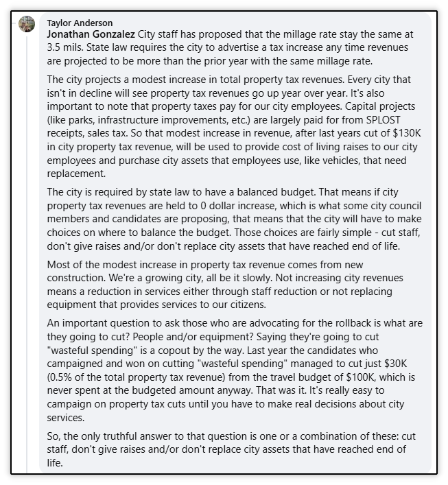 Pretty straightforward question - if you rollback the millage rate to hold 2025 city revenue to the same amount as 2024, you MUST make cuts because inflation alone has reduced the value of the dollar over the prior year.