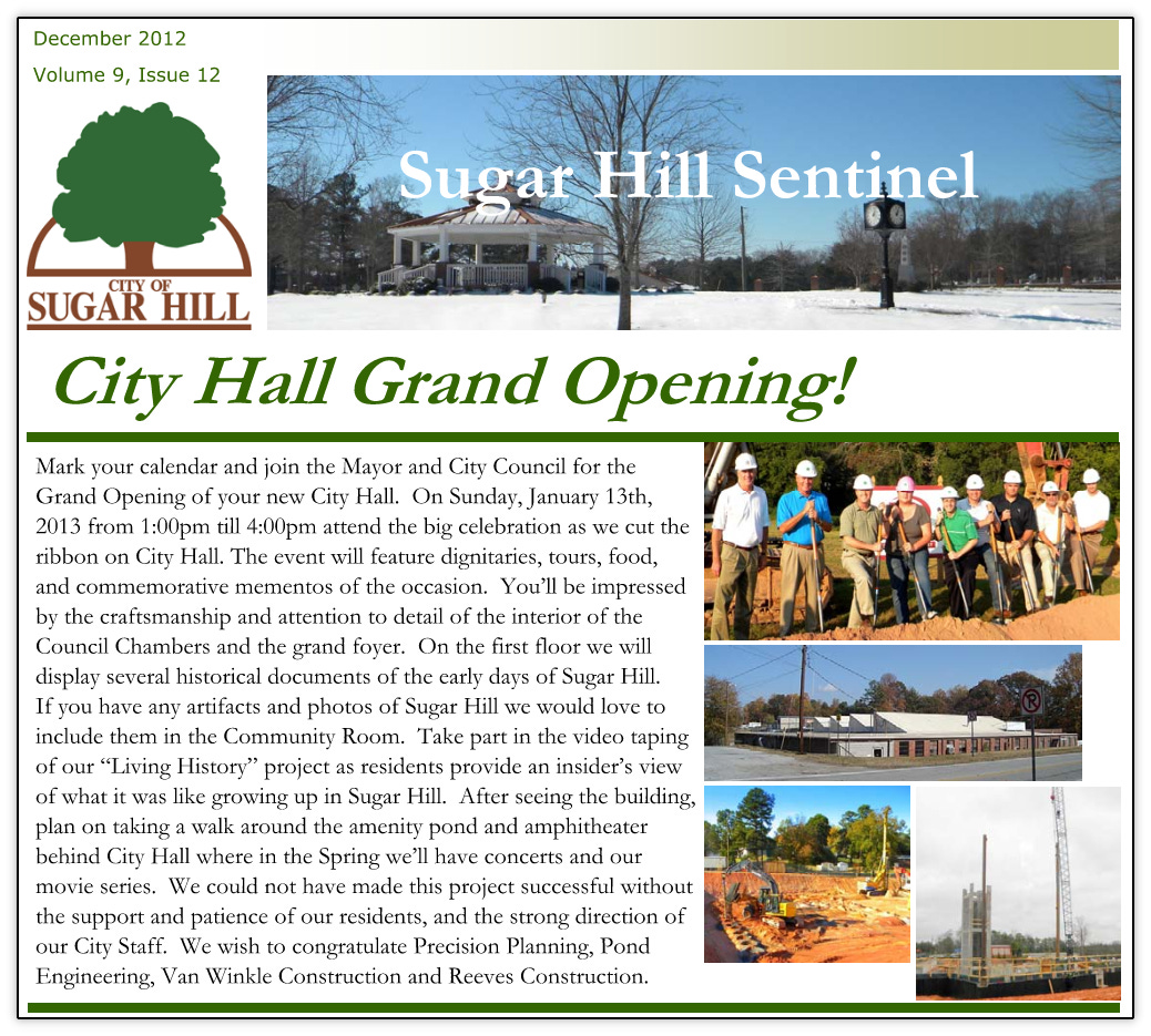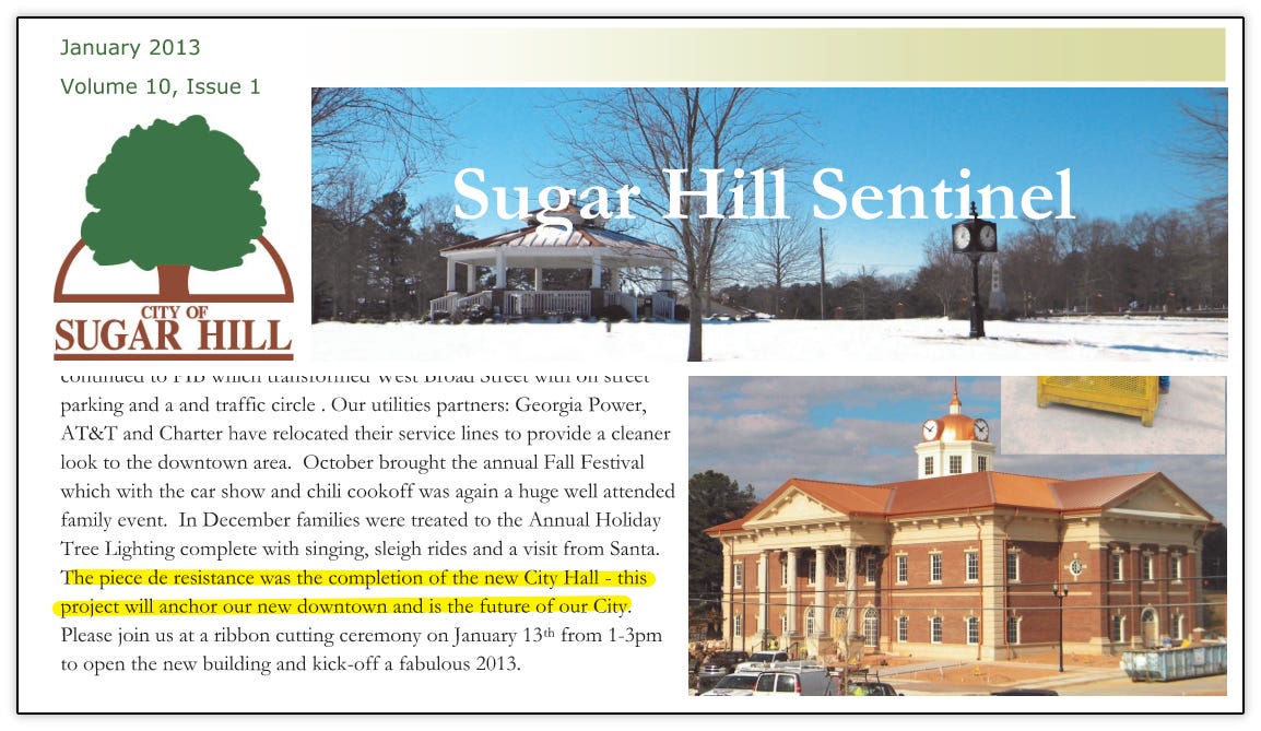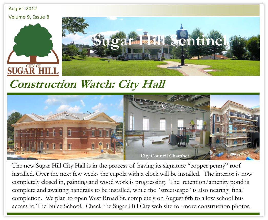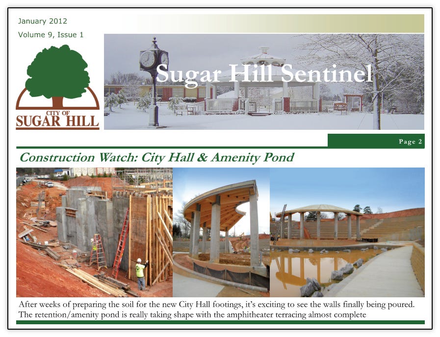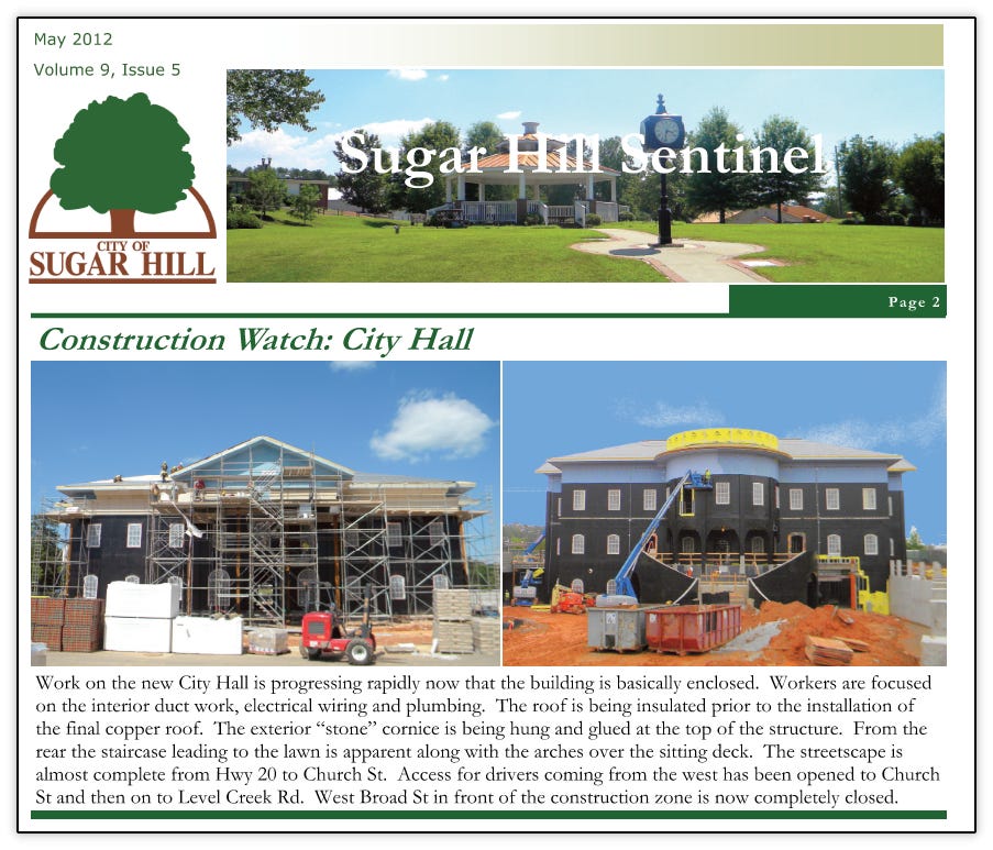 As was outlined in this previous article, the city broke ground on the new City Hall and West Broad Street in October 2010 that were to become the cornerstone and bedrock of the new downtown. Construction continued all through 2011 and 2012. Below are various updates from the city’s newsletter at the time, Sugar Hill Sentinel documenting the progress.