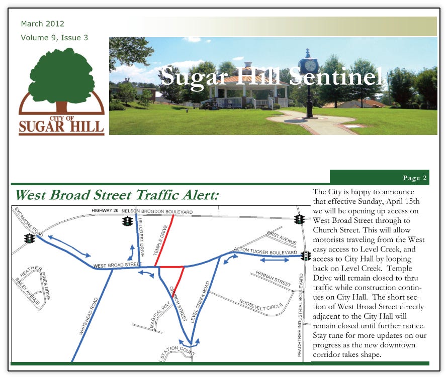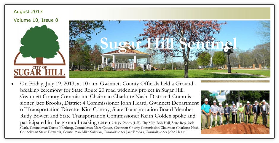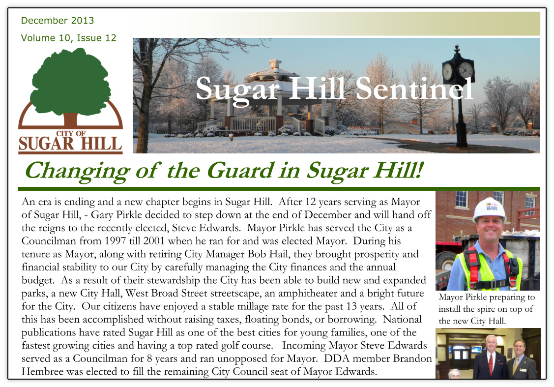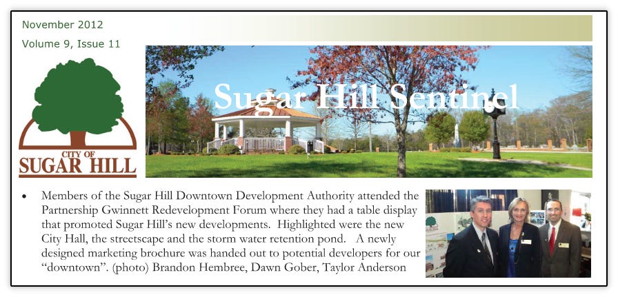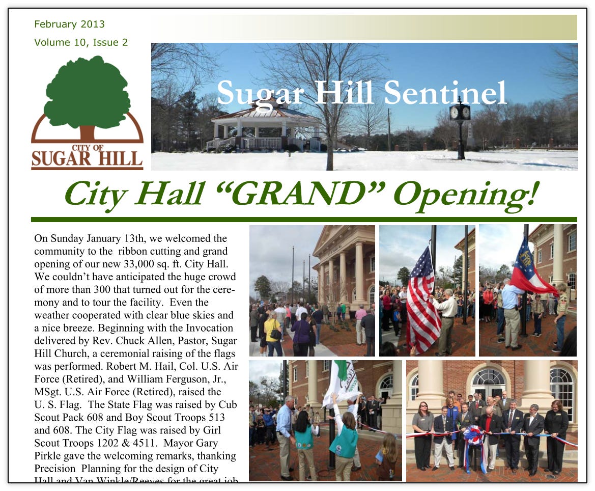 As was outlined in this previous article, the city broke ground on the new City Hall and West Broad Street in October 2010 that were to become the cornerstone and bedrock of the new downtown. Construction continued all through 2011 and 2012. Below are various updates from the city’s newsletter at the time, Sugar Hill Sentinel documenting the progress.