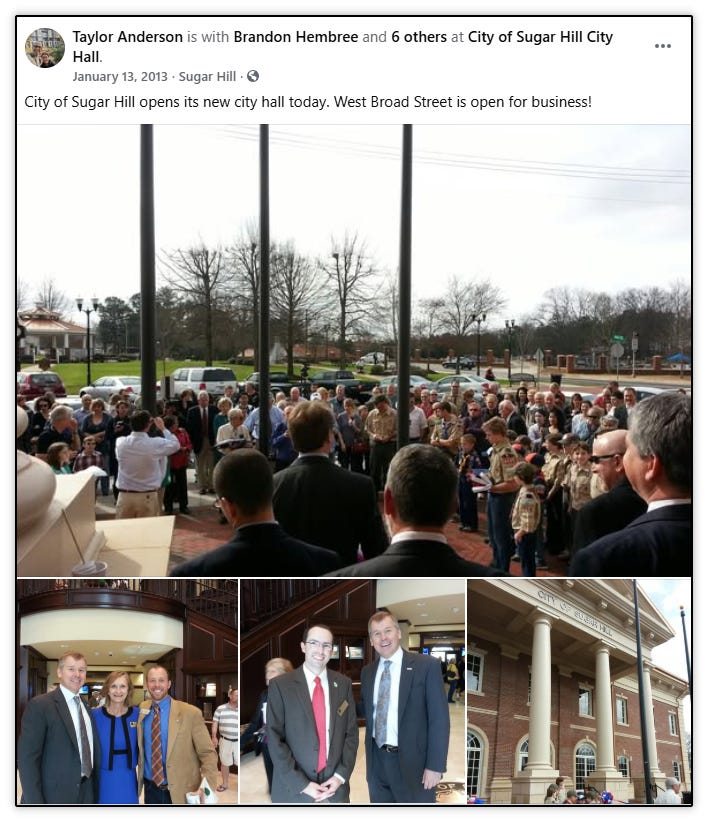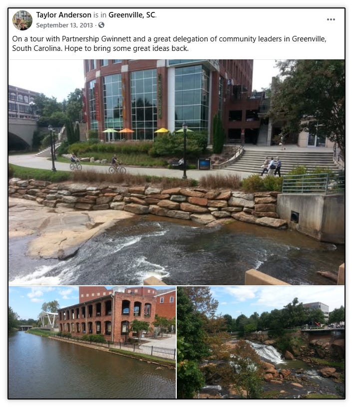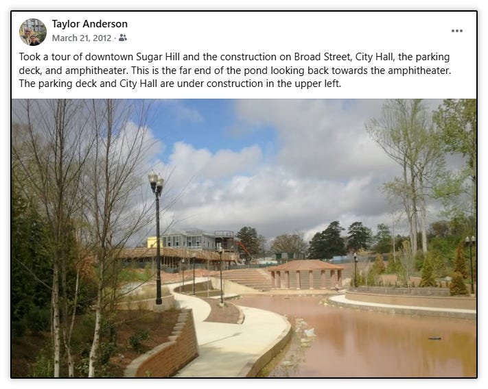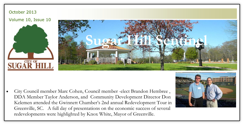 The city’s push for downtown included attendance at the Gwinnett Chamber’s Redevelopment Tour in Greenville, South Carolina in October 2013. Greenville would become a constant source of inspiration for downtown Sugar Hill, with it’s Main Street between the Reedy River and the Hyatt, and Sugar Hill’s main street, West Broad Street between PIB and Hwy, covering the same 3/4 mile distance.
