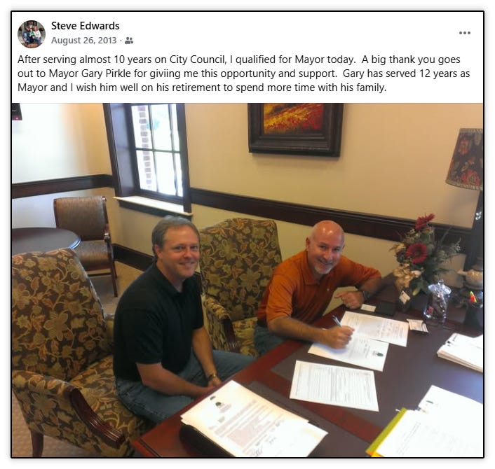 Also in 2013, Mayor Gary Pirkle announced he would not run again after 12 years as Mayor. He endorsed then City Council Member Steve Edwards for Mayor. Steve Edwards was the lone qualifier for Mayor and would assume the role in January 2014.