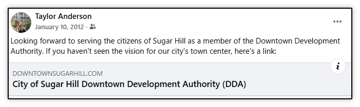 In January 2012, current Mayor Brandon Hembree, who recently won re-election for a second term, would join the Downtown Development Authority (DDA), his first role with the city. I would join him at the same time on the DDA. I had read the vision from the 2005 Town Center Master Plan and was excited to be a part of the team bringing that to reality.